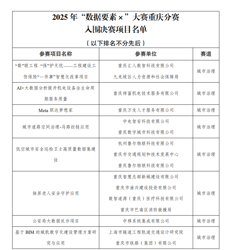 热烈祝贺重庆祥富机电技术服务有限公司,凭借《AI+大数据分析提升机电设备全生命周期服务质量》项目,成功入围2025年“数据要素×”大赛重庆分赛决赛!